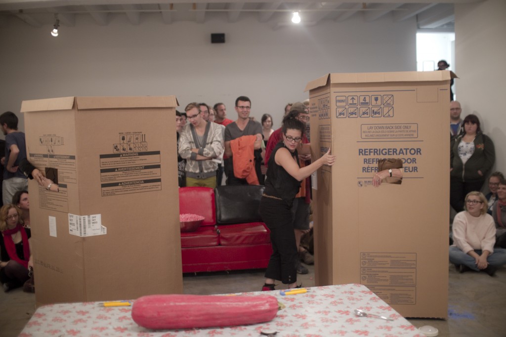 Invitation des commissaires Julie-Andrée T. et Constanza Camelo-Suarez pour le centre d’artistes Le Lobe dans le cadre des Rencontres Internationales des Arts de la Performance – RIAP, au Saguenay. Avatars est une performance réalisée en collaboration avec quatre dames âgées d’environ quatre-vingt ans. Canevas. Quatre dames arrivent dans des boîtes de réfrigérateur. Elles tiennent une Poulpe par la main. À l’aide d’exacto elles sortent de leur boîte en découpant la silhouette d’une des Poulpes puis les quatre dames vont à une table et détruisent une courge à l’aide d’ustensiles. Les Poulpes partagent un énorme plat de pop corn. Rose, bien entendu.