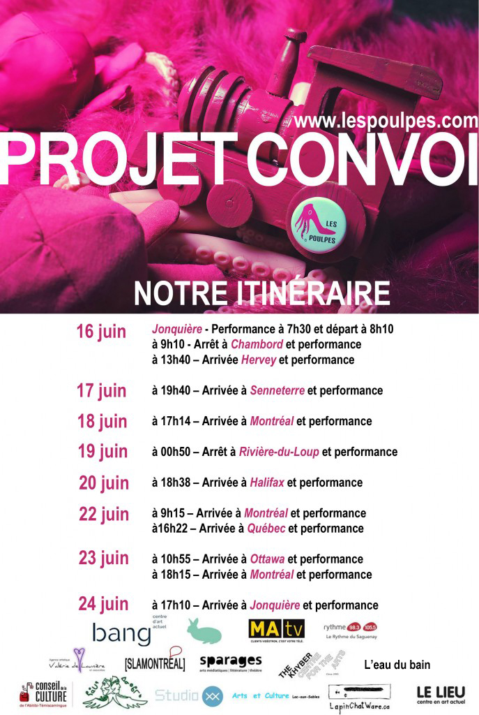 Les Poulpes se déploient sur de multiples plateformes, en plus d’alimenter leur site web des vidéos de chaque performance, nous avons tourné une série-documentaire de 10 épisodes de 14 minutes sur leur expérience en mouvance, leur processus de travail à la rencontre du territoire québécois et canadien, des publications (revues et fanzine) sont prévues en lien avec le projet et ce, en plus des performances réalisées aux différentes gares auxquelles le public a été convié. Les différentes plateformes s’agglomèrent à un projet global afin de faire exister Convoi, un projet d’art interdisciplinaire tentaculaire. Un convoi de poulpes se prépare !