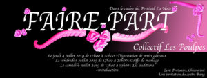 Dans le cadre du festival La Noce, le collectif Les Poulpes propose le projet Faire-part, une installaction évolutive construite autour du miroitement, dans un espace conteneur coiffé d’un gâteau. Vous êtes à la recherche de parfaites demoiselles d’honneur ? Les Poulpes vous invitent à trois moments d’actions performatives, en continue, où leurs qualités d’organisatrices de mariage sont rudement mise à l’épreuve.