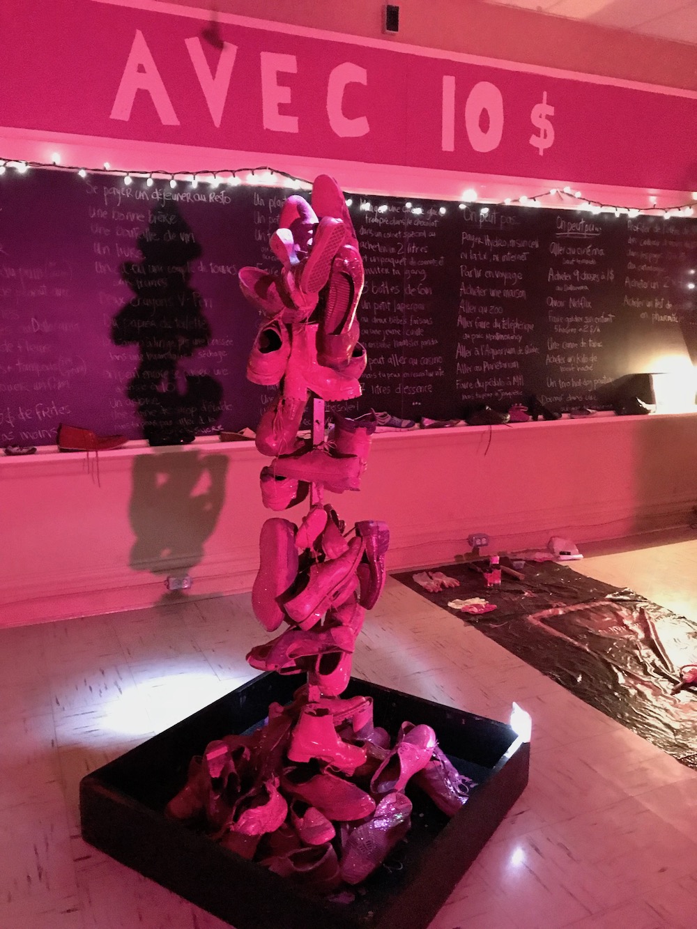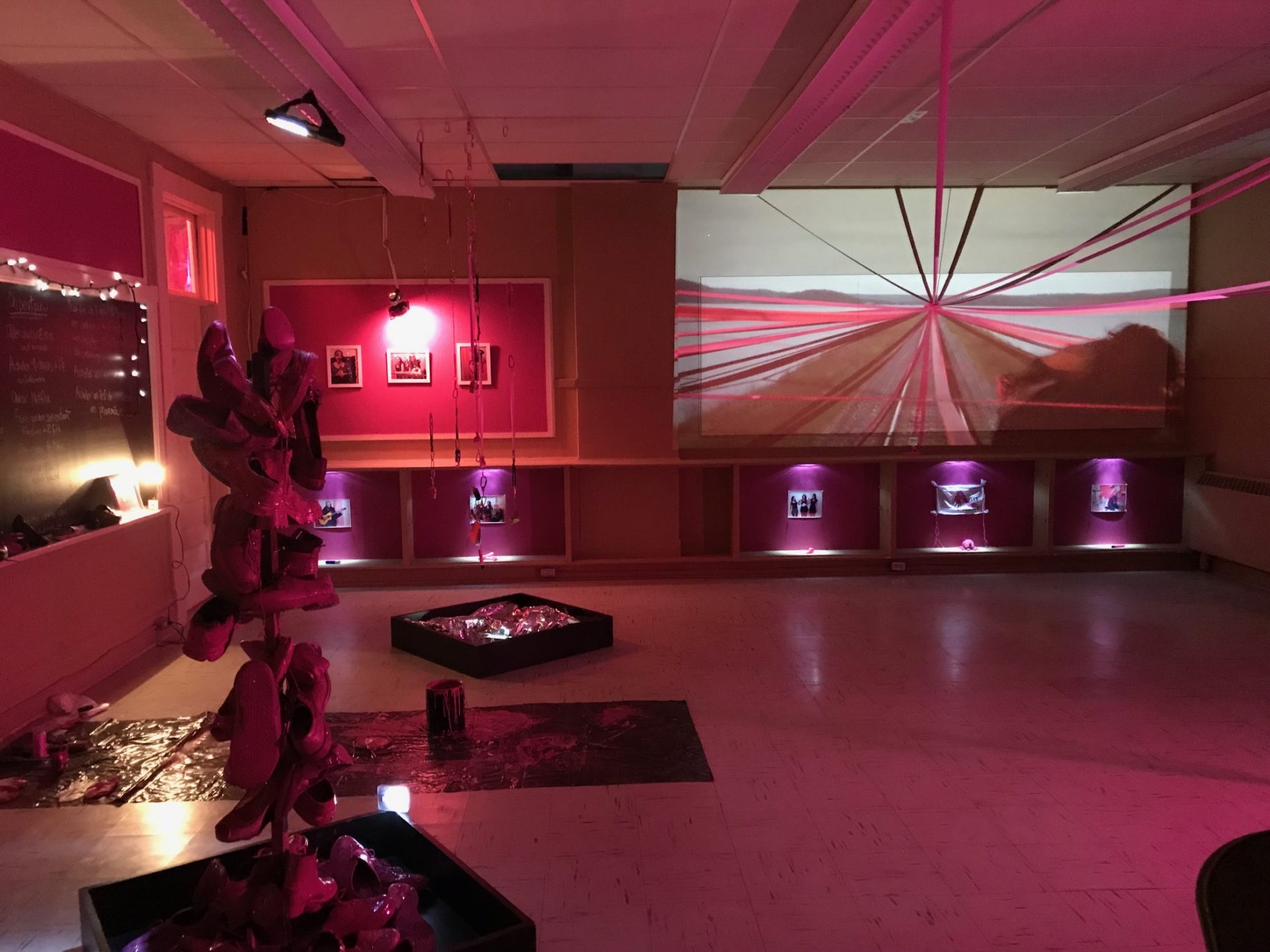 À qui? La question, clin d’oeil au mot « territoire » en Anishinaabemowin, confronte le spectateur sur sa relation avec l’espace qu’il occupe, et invite à redéfinir la notion de vivre-ensemble à la lumière des enjeux contemporains liés au partage de la terre.
